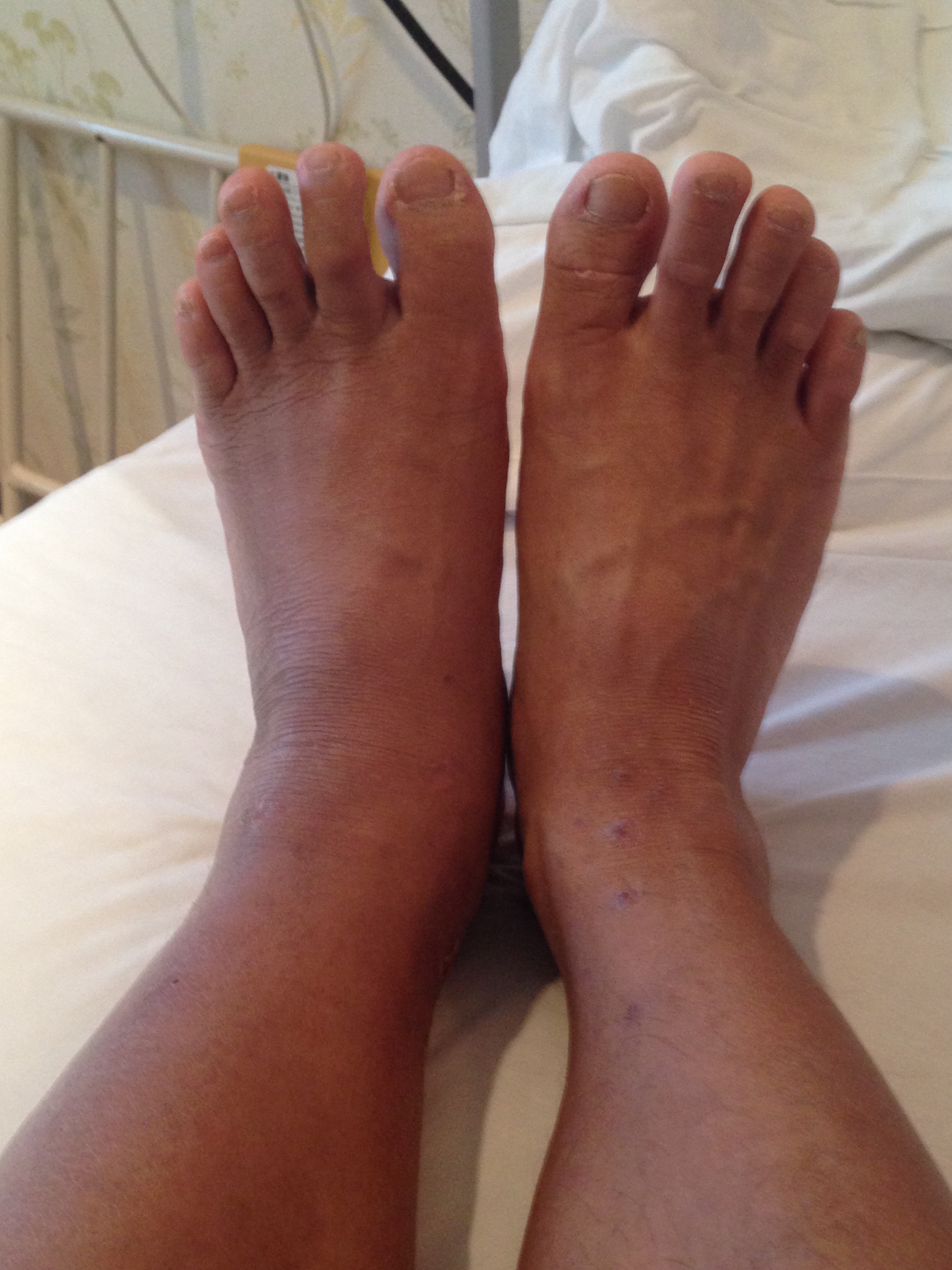 左右の足の違い、右足は足首がくびれてふくらはぎの血管がくっきりしています。