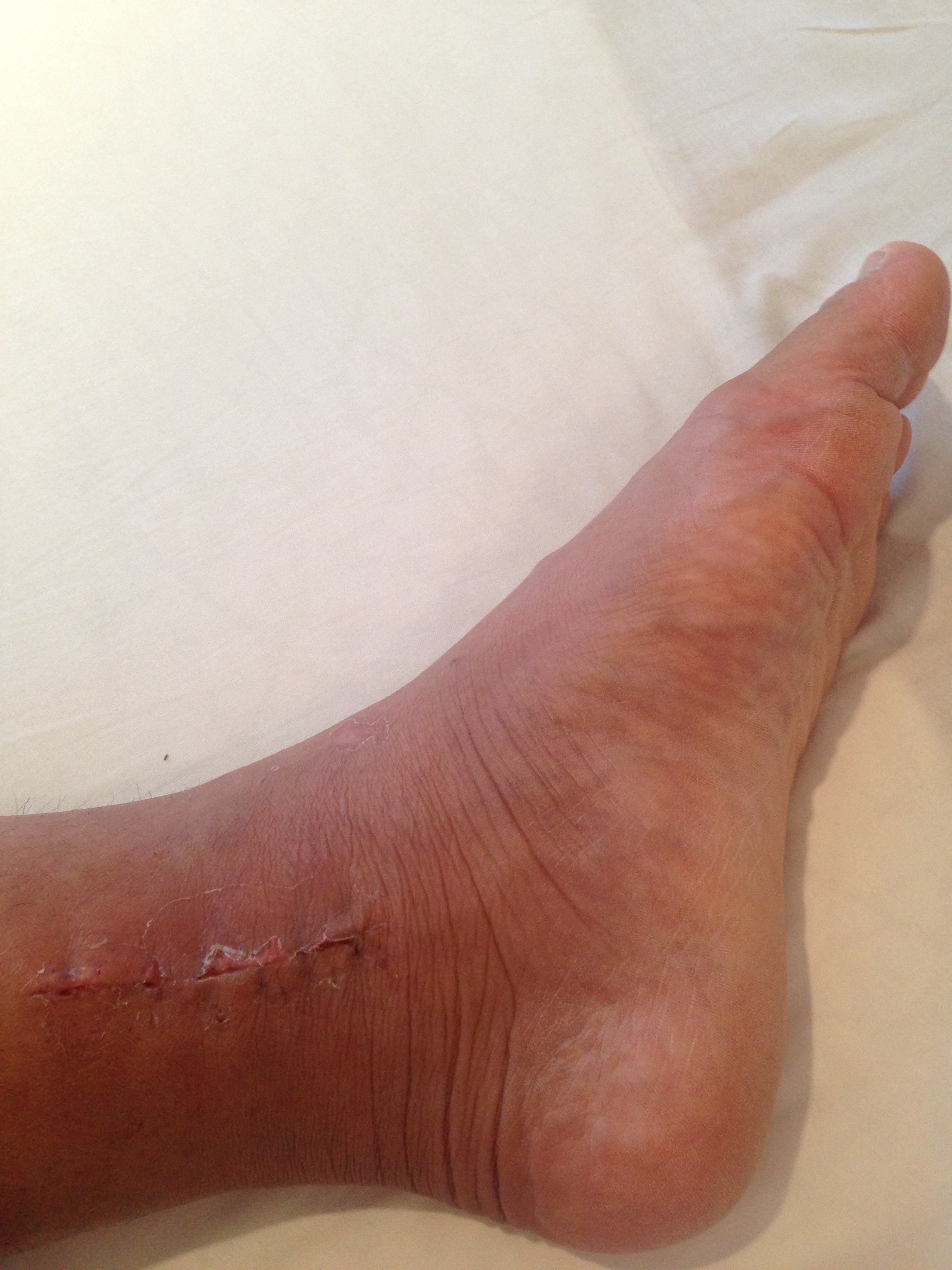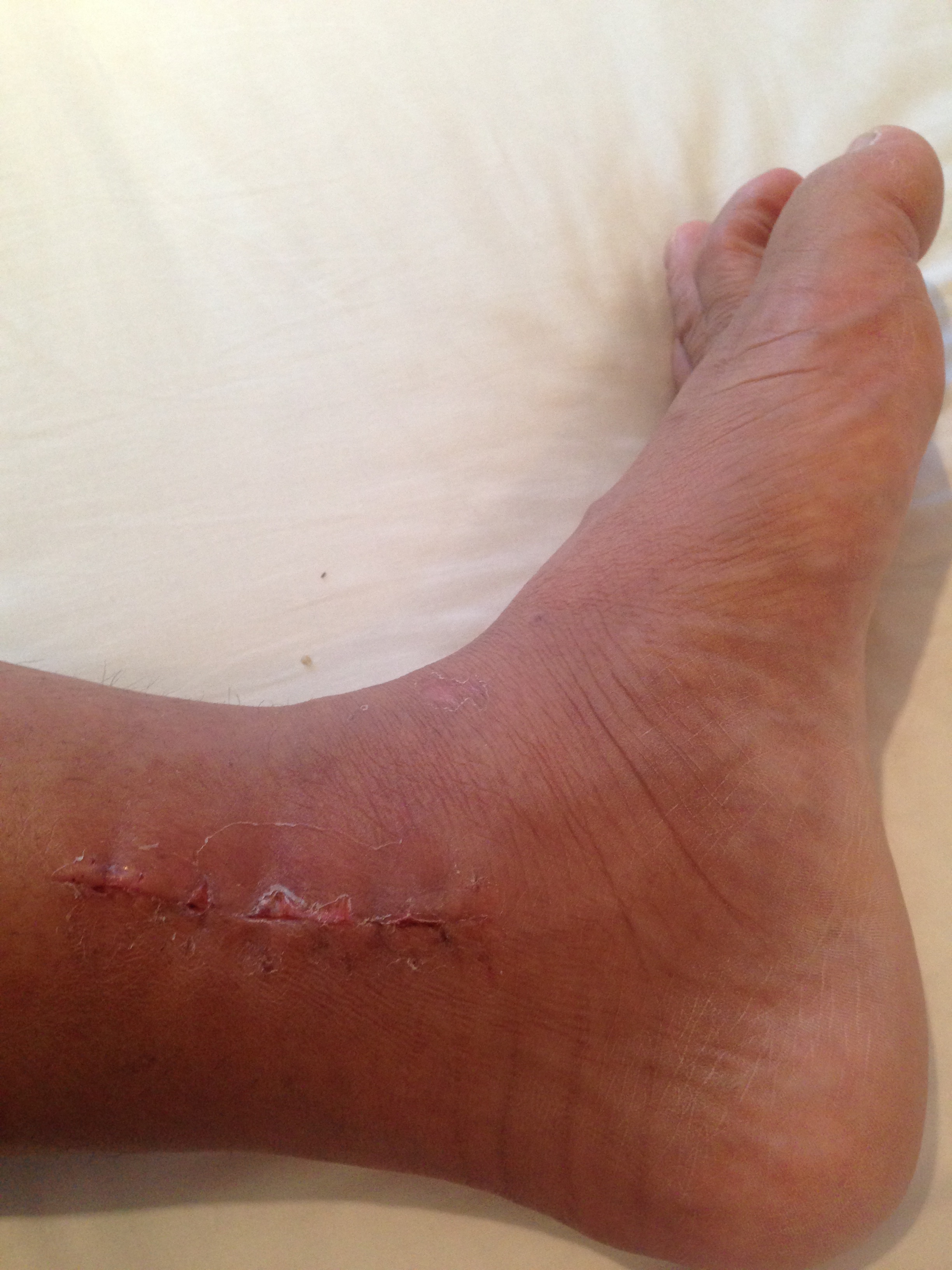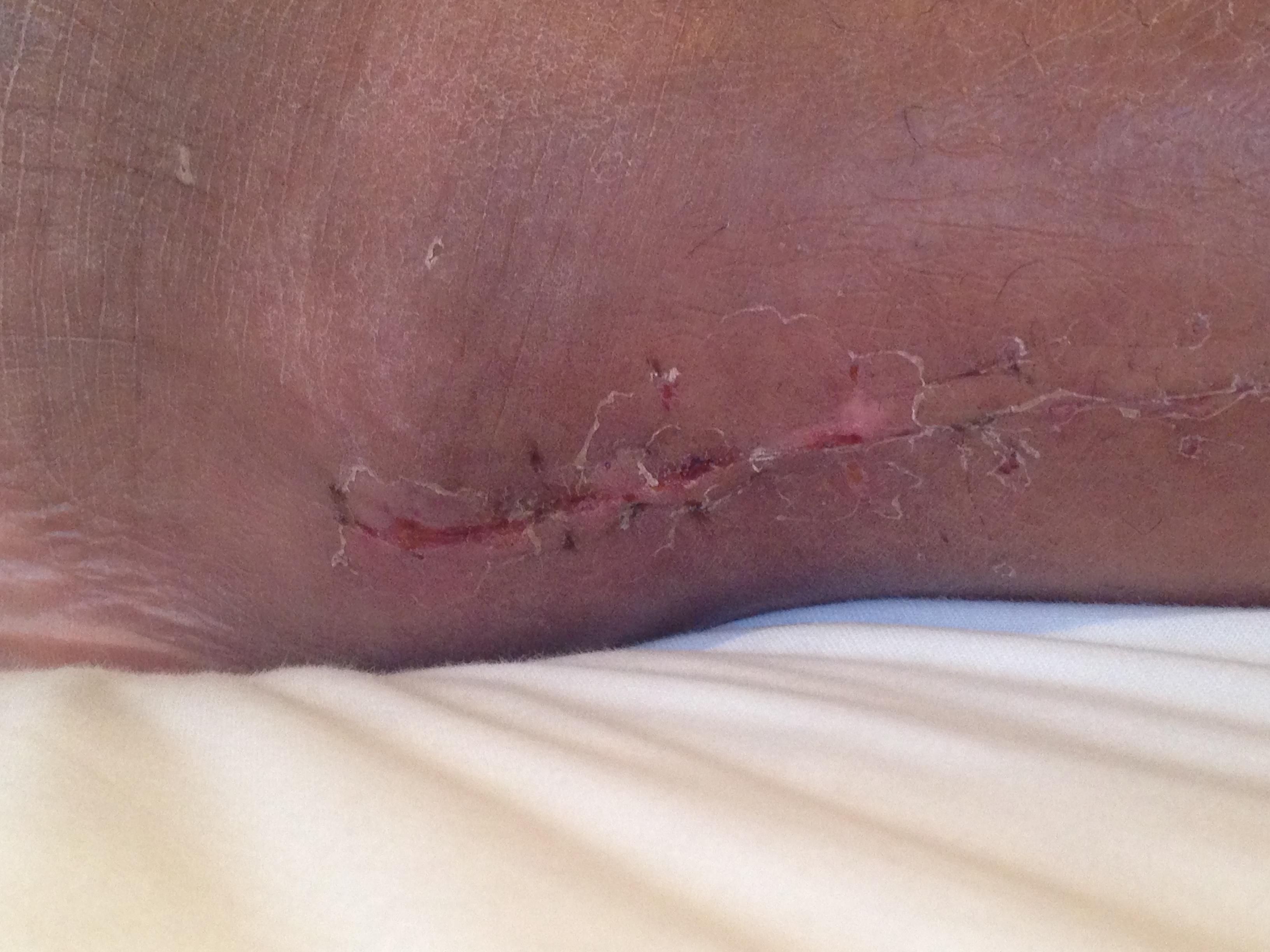 傷口(左足の外側) カカト付近は少し赤く一部湿った感じあり、ふくらはぎ部分はキレイに塞がってきています。順調な感じ