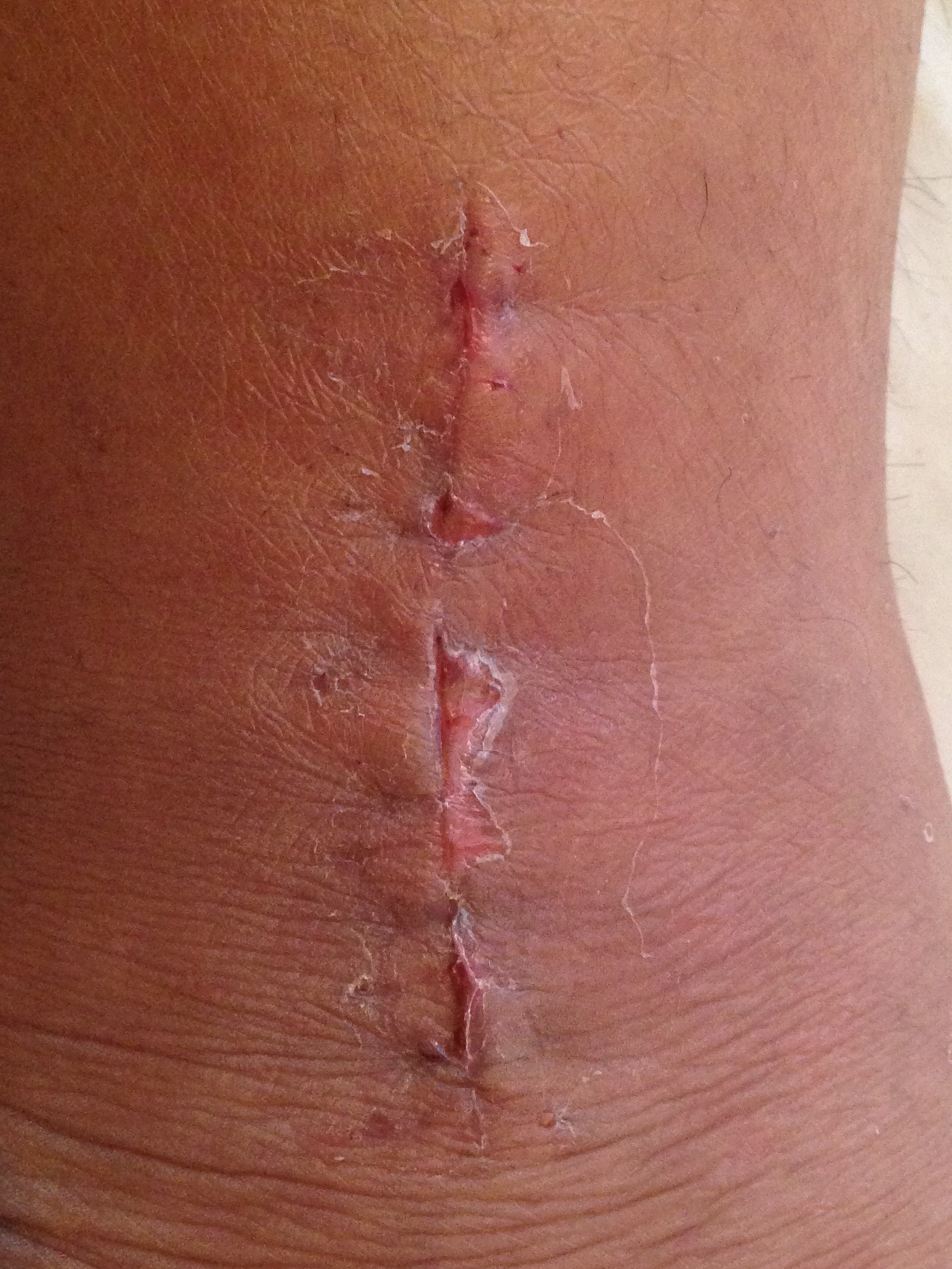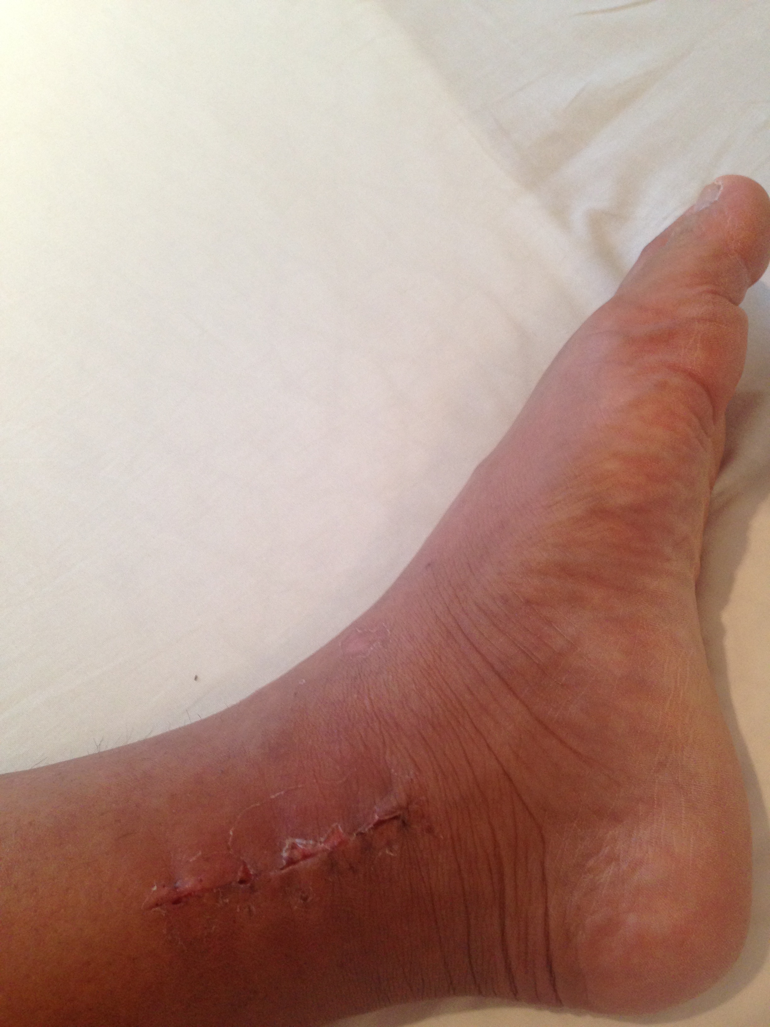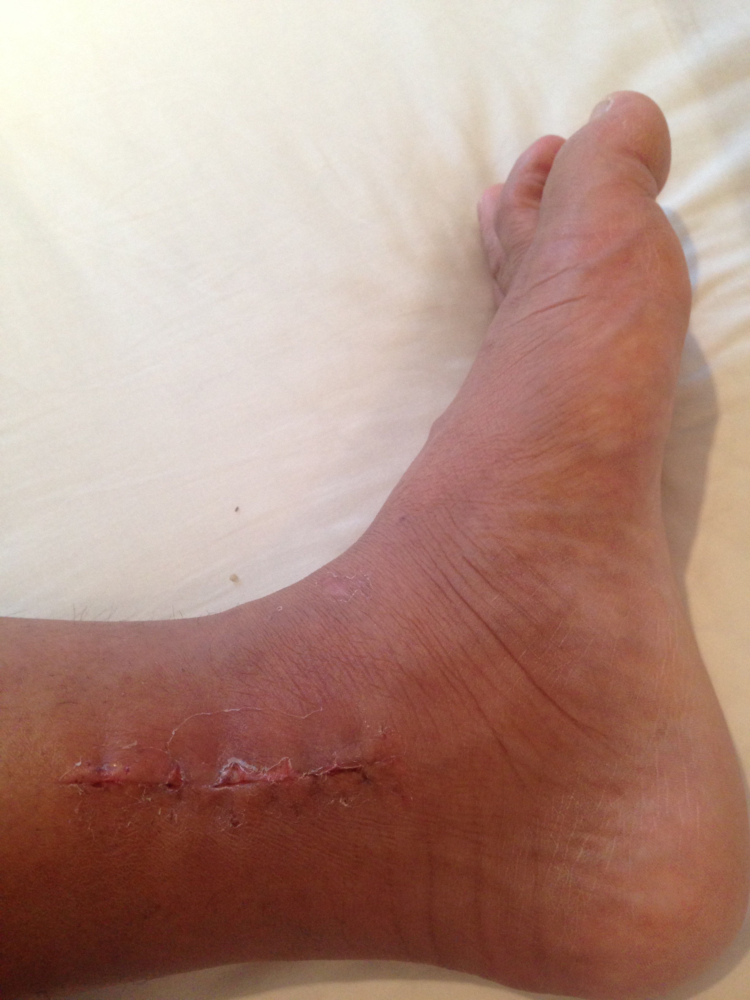 傷口(左足の外側) カカト付近は少し赤く一部湿った感じあり、ふくらはぎ部分はキレイに塞がってきています。順調な感じ