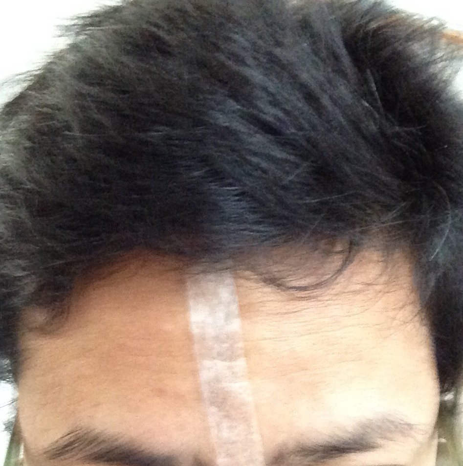 額の傷のようす。大分目立たなくなってきておりますが、外出の際は日焼け止めでテープなどを貼ってます。(日焼けすると色素が沈着して傷跡が残りやすくなるようです。)