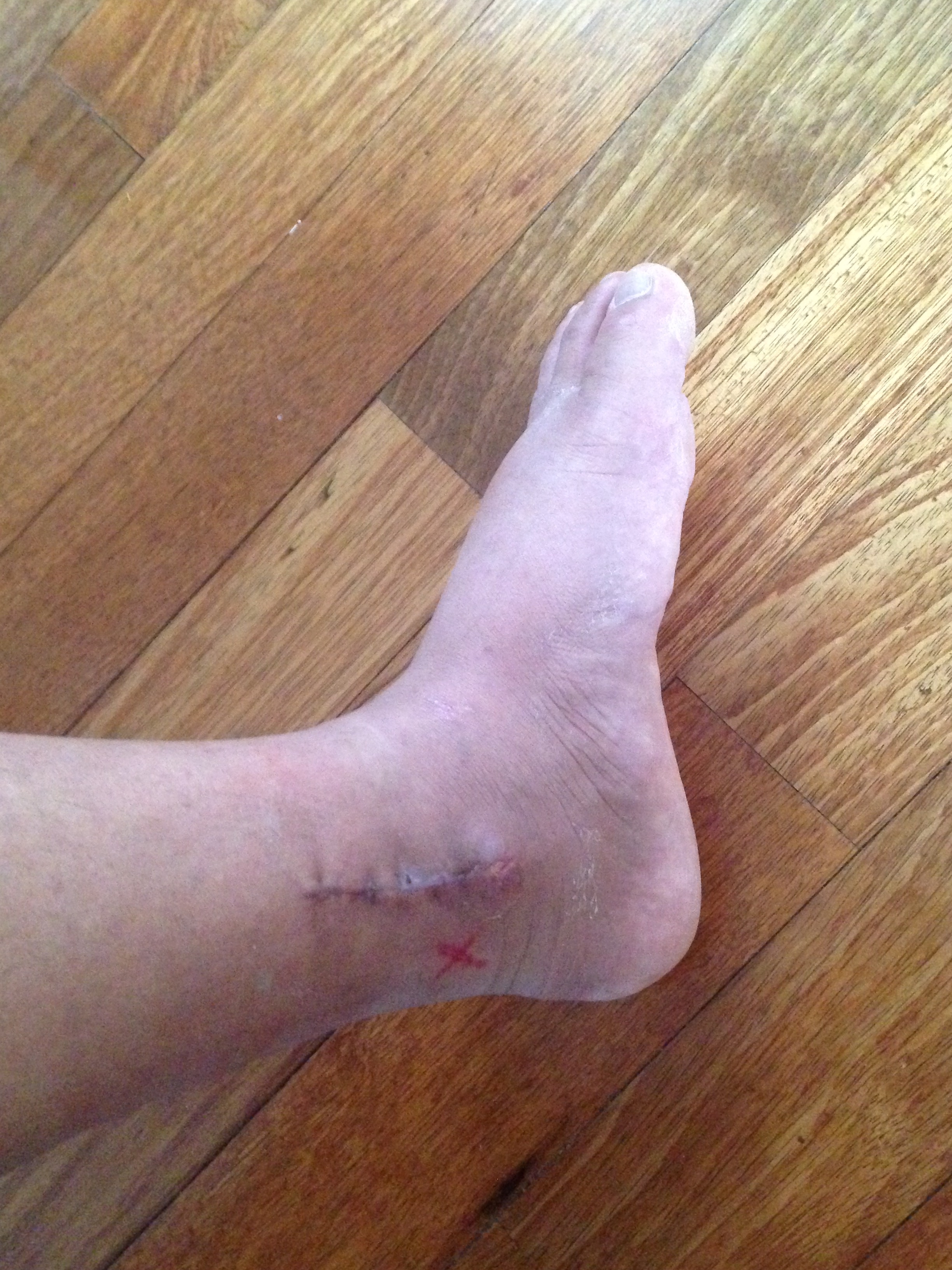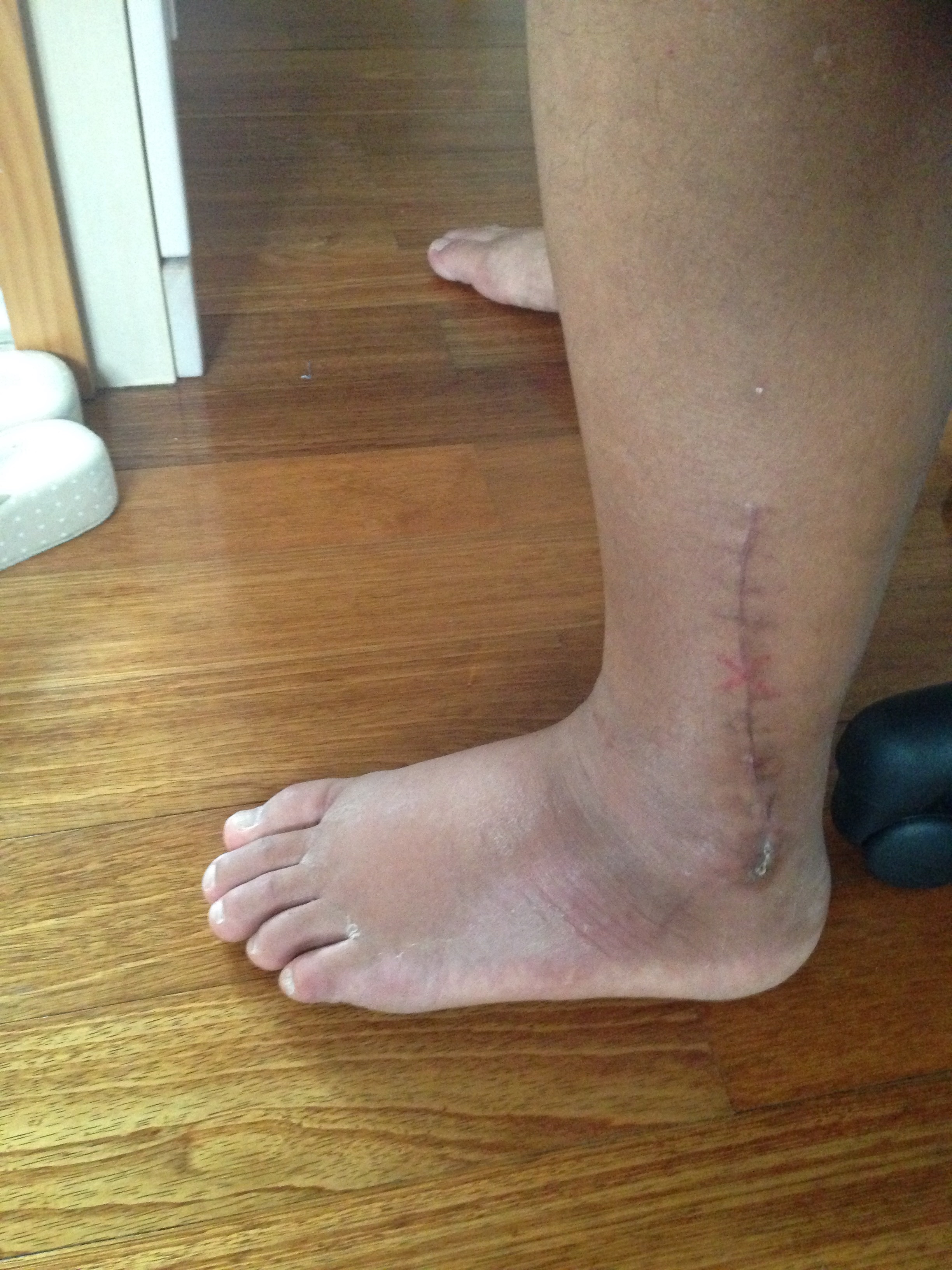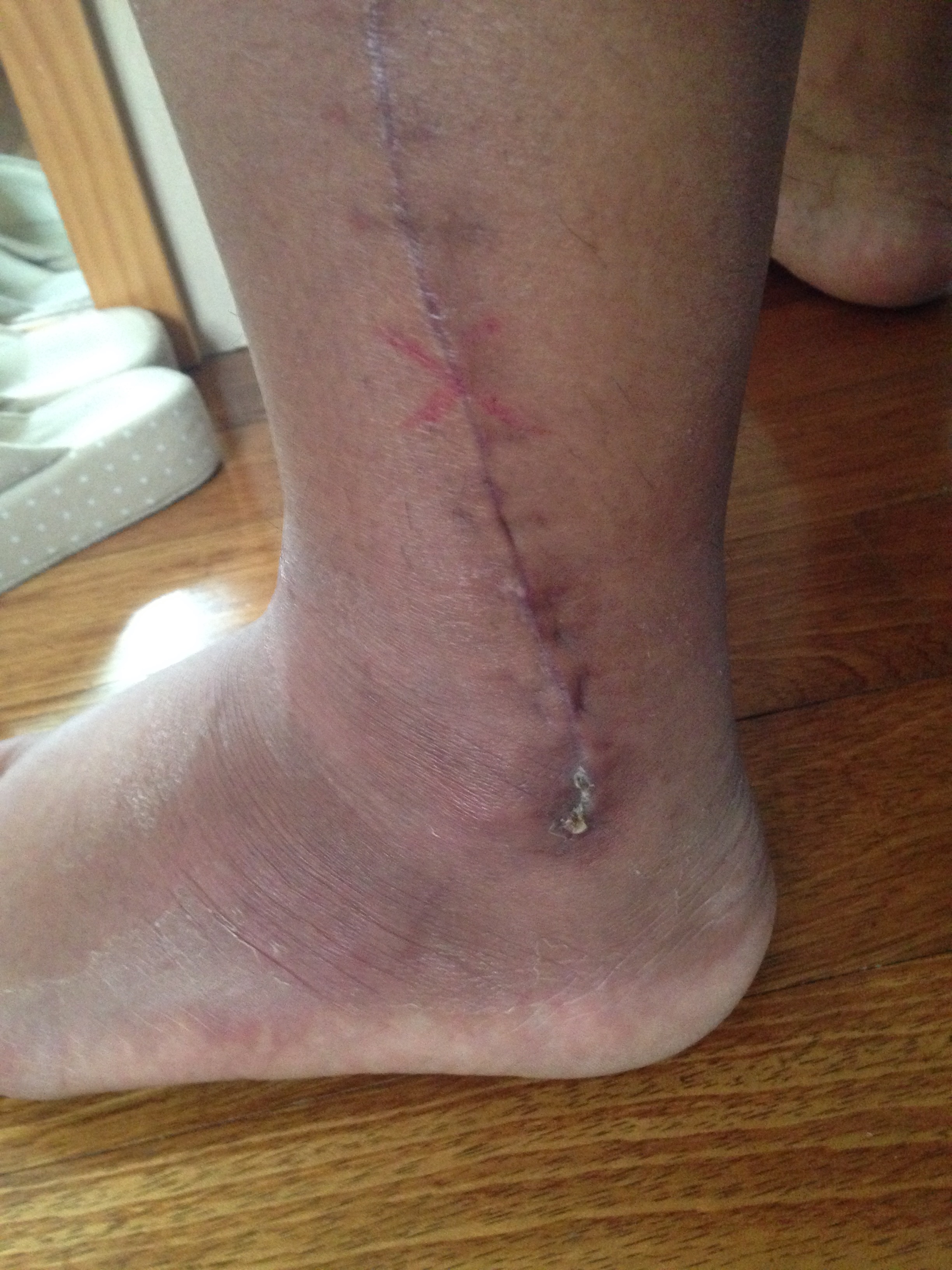 左脚の踵の外側の様子。こちら腓骨がキレイにポッキリ折れていて、プレートにて繋がれています。