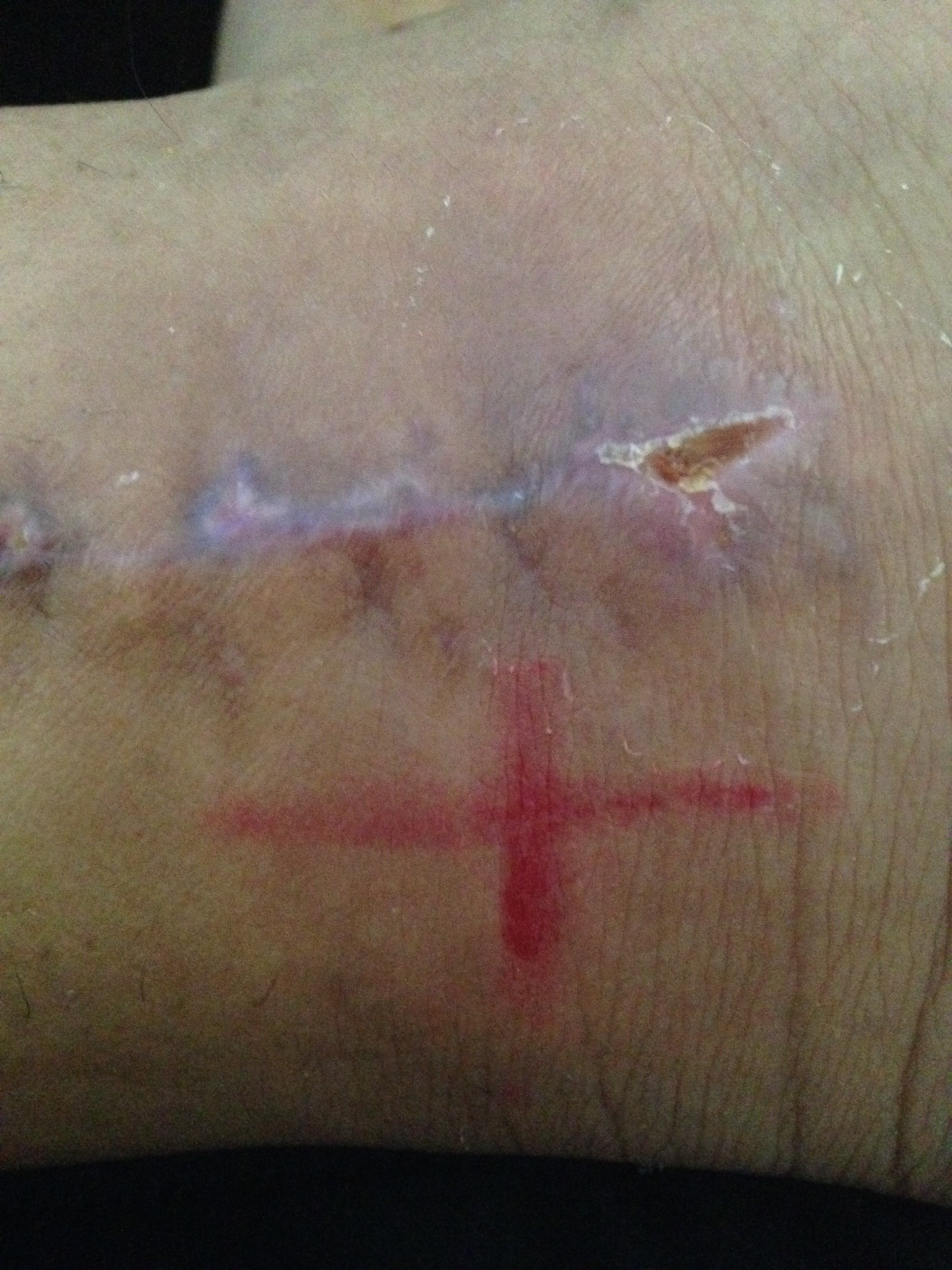 すねの外側で、印は超音波治療の時ここに当てるという印。