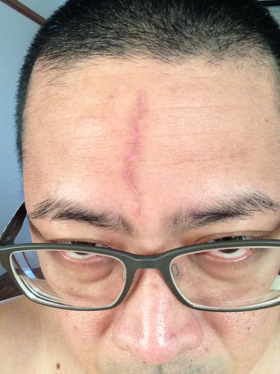 額の傷の様子、いつも医療用のテープをはって保護したりしています。